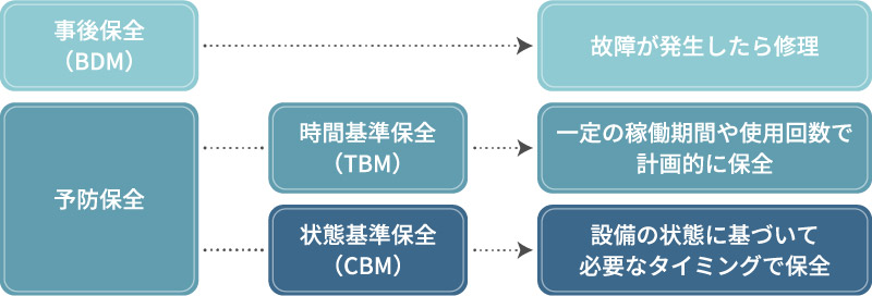 Andererseits beobachtet die Staatsstandardwartung (Bedingungsbasierte Wartung) die Echtzeitdaten von Möglichkeiten und ist Technik, um auf einem Staat gestützte Wartung auszuführen. Auf diese Weise wird die passendste Wartung in einem notwendigen Timing ermöglicht und kann Verschwendung und ein Risiko reduzieren.