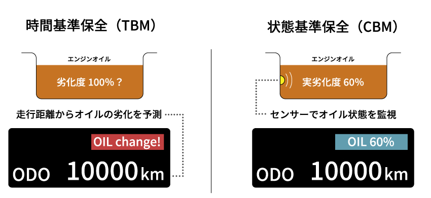 Zum Beispiel ist es üblich, den Austausch vom Motoröl durchzuführen, regelmäßig nach der Meilenzahl und die Periode des Autos urteilend, wenn es ein Auto als ein Beispiel zitiert. Bezüglich der Anzeige ist es für einen Fahrer schwierig, die Zeit zu berechnen, wenn Austausch genau durch den Fahrzustand des Autos notwendig ist, verschieden zu sein. In späten Jahren nicht nur sind die einfache Meilenzahl sondern auch das Fahrzeug, das die Frequenz der Anzahl von Revolutionen des Motors und des kurzfristigen Laufs zerlegbar beurteilt, und Austausch des Öls und die Fahrzeugmessenqualität des Öls direkt fördert, und die Informationen geboren, dass diese Autos Richterverfall des Öls mehr genau bieten und die Wartung im passenden Timing ermöglichen.