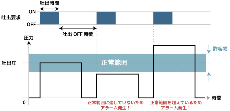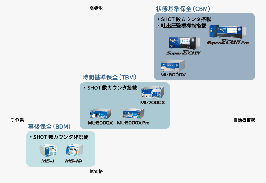 Unter unseren Luftpulsmethodenautomaten werden ML-8000X und die SuperΣCMIV Reihe mit einem "Entladungsdruck ausgestattet, der" Funktion als eine neue Eigenschaft kontrolliert. Auf diese Weise, jede Entladungsbewegung, kann ich es beobachten, ob Druck, um aus einem Automaten zu kommen, gemäß der Einstellung ist. Ganz zu schweigen von wie man verwendet, um das Timing zu wissen, als ich eine Abnormität in einer Entladung durch die Warnung hatte, habe ich Frequenz der Warnung und der schlechten Ausbruchsituation in der Produktionsstätte des Kunden zusammen gestellt, und indem ich Korrelation analysiert habe, optimiere ein Timing der Wartung und kann nutzlose Kosten reduzieren.